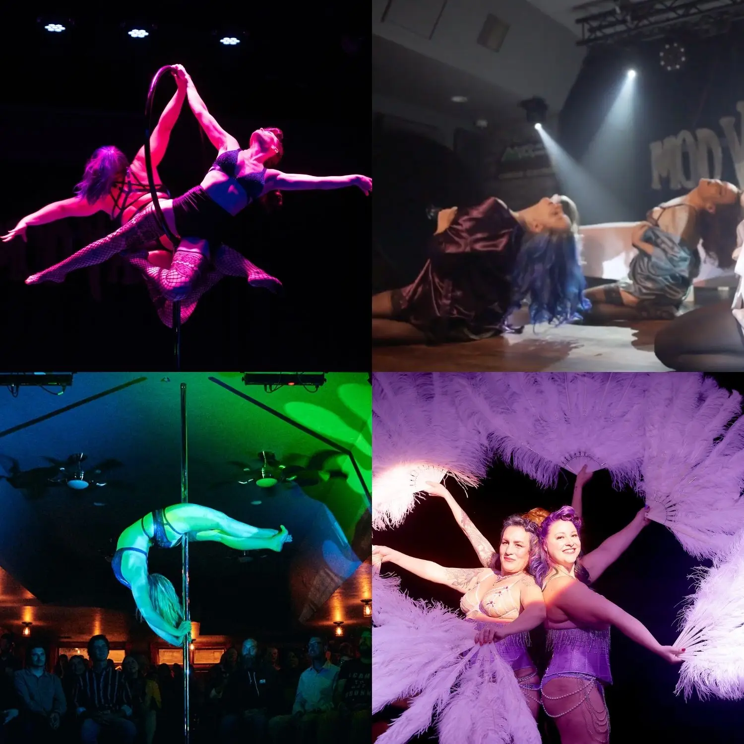Mod Vaude creates bold, immersive cabaret that blends dance, burlesque, aerial, and theatrical storytelling. Each production is built around strong themes, striking visuals, and the live energy between performer and audience.